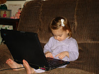 Savannah saw Daddy's laptop on the couch. She decided that she was going to sit down and work on it. She climbed up on the couch and pulled it onto her lap, just like Daddy. When she turns 3 she will be asking for her own computer!
